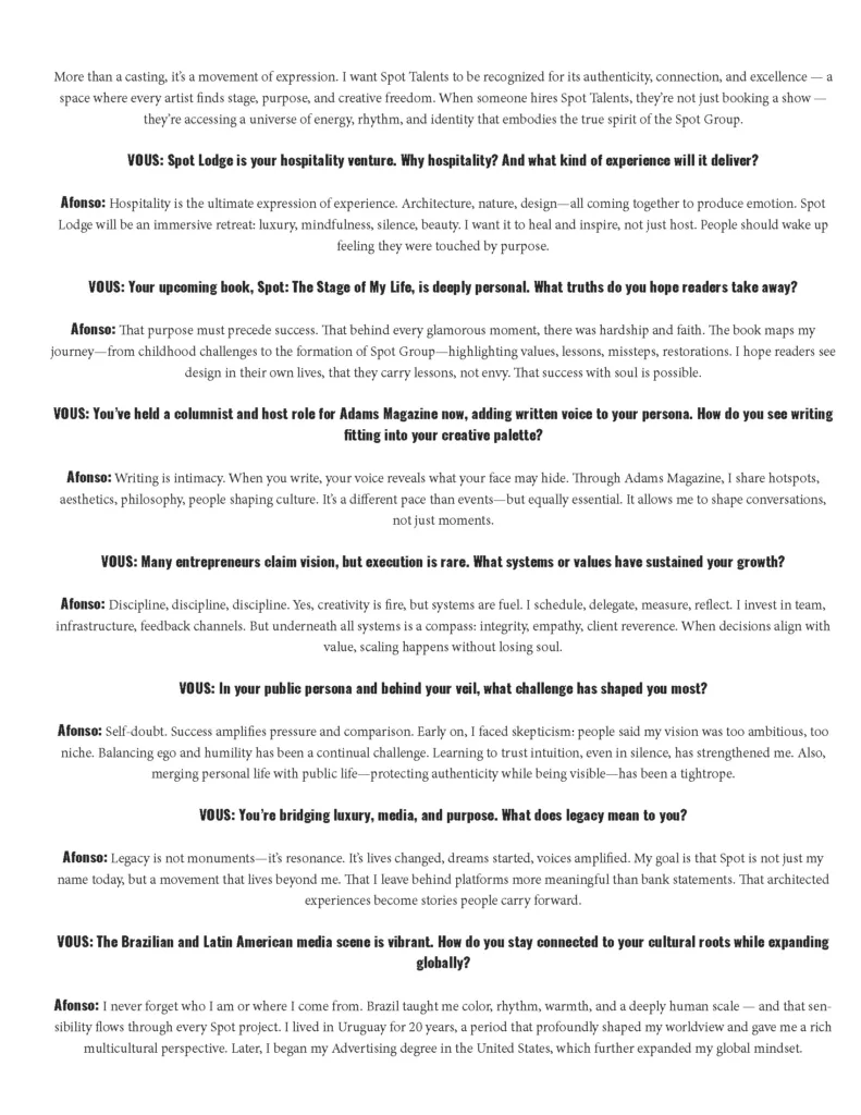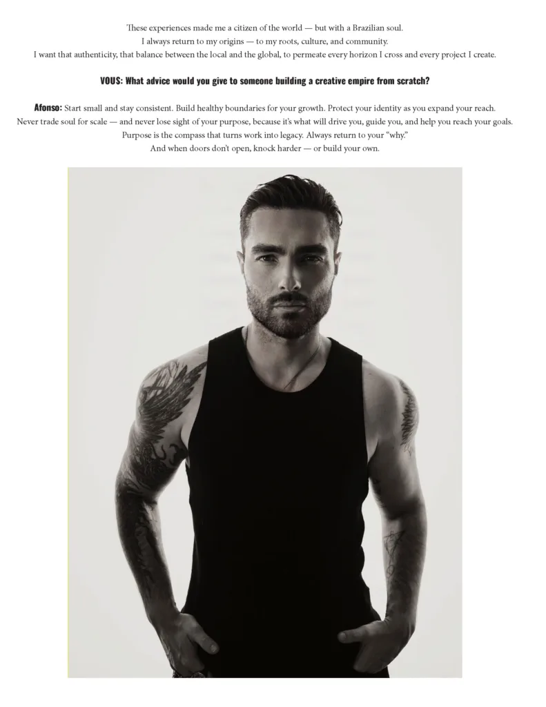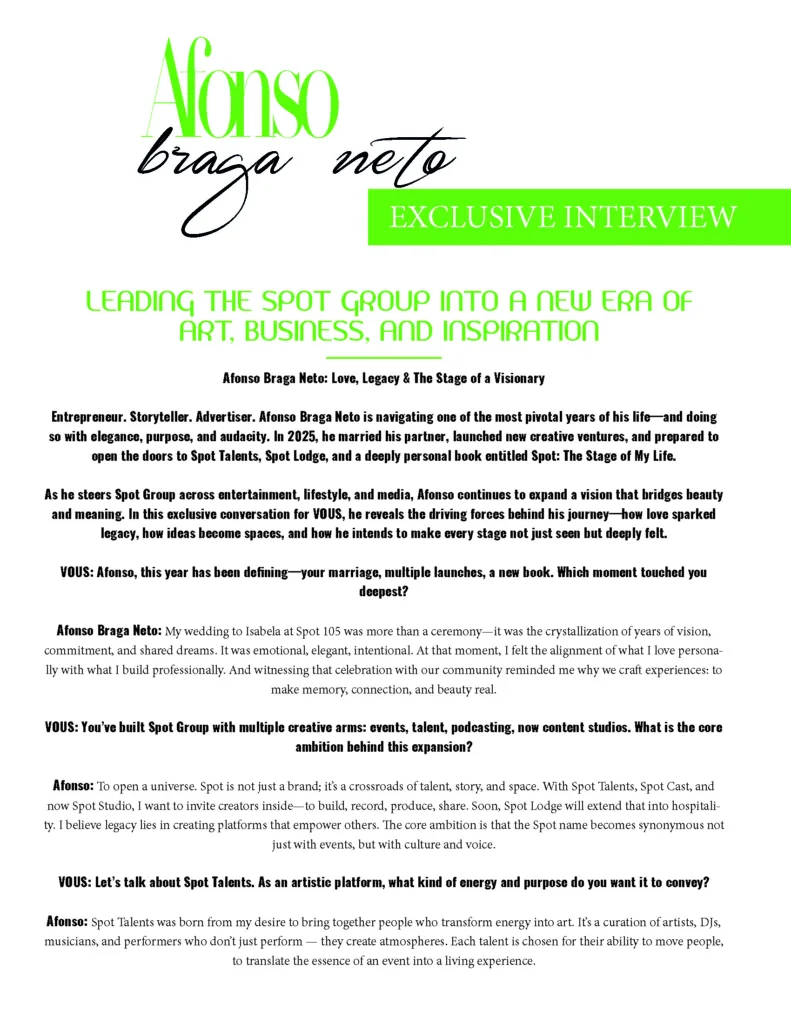 As he steers Spot Group across entertainment, lifestyle, and media, Afonso continues to expand a vision that bridges beauty and meaning. In this exclusive conversation for VOUS, he reveals the driving forces behind his journey—how love sparked legacy, how ideas become spaces, and how he intends to make every stage not just seen but deeply felt.