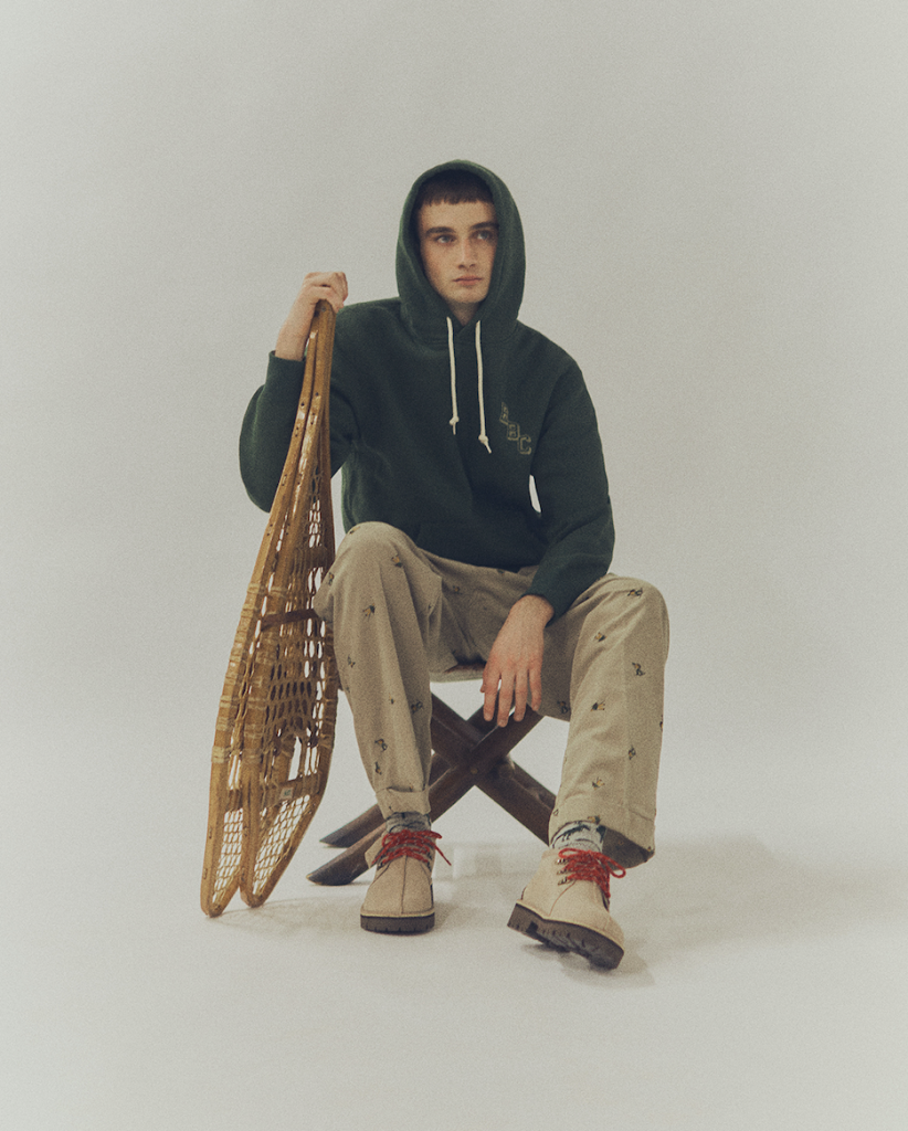 A standout piece in the collection is a down-filled coat, taking inspiration from heritage ski jackets. Available in green and beige, the coat is adorned with collaborative patches, showcasing a retro-inspired ski club print and a co-branded varsity emblem.