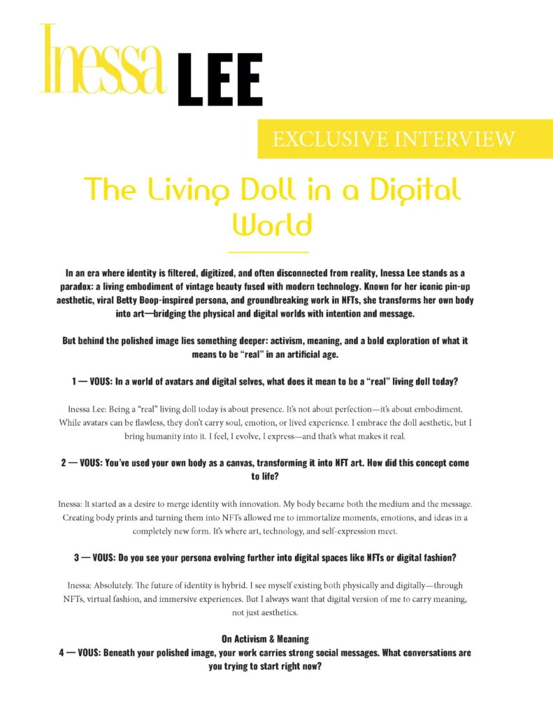 In an era where identity is filtered, digitized, and often disconnected from reality, Inessa Lee stands as a paradox: a living embodiment of vintage beauty fused with modern technology. Known for her iconic pin-up aesthetic, viral Betty Boop-inspired persona, and groundbreaking work in NFTs, she transforms her own body into art—bridging the physical and digital worlds with intention and message.