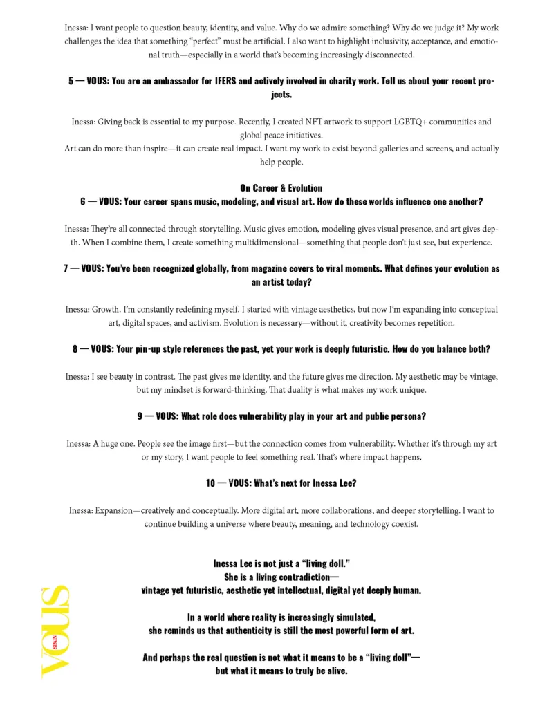 Inessa Lee: Being a “real” living doll today is about presence. It’s not about perfection—it’s about embodiment. While avatars can be flawless, they don’t carry soul, emotion, or lived experience. I embrace the doll aesthetic, but I bring humanity into it. I feel, I evolve, I express—and that’s what makes it real.