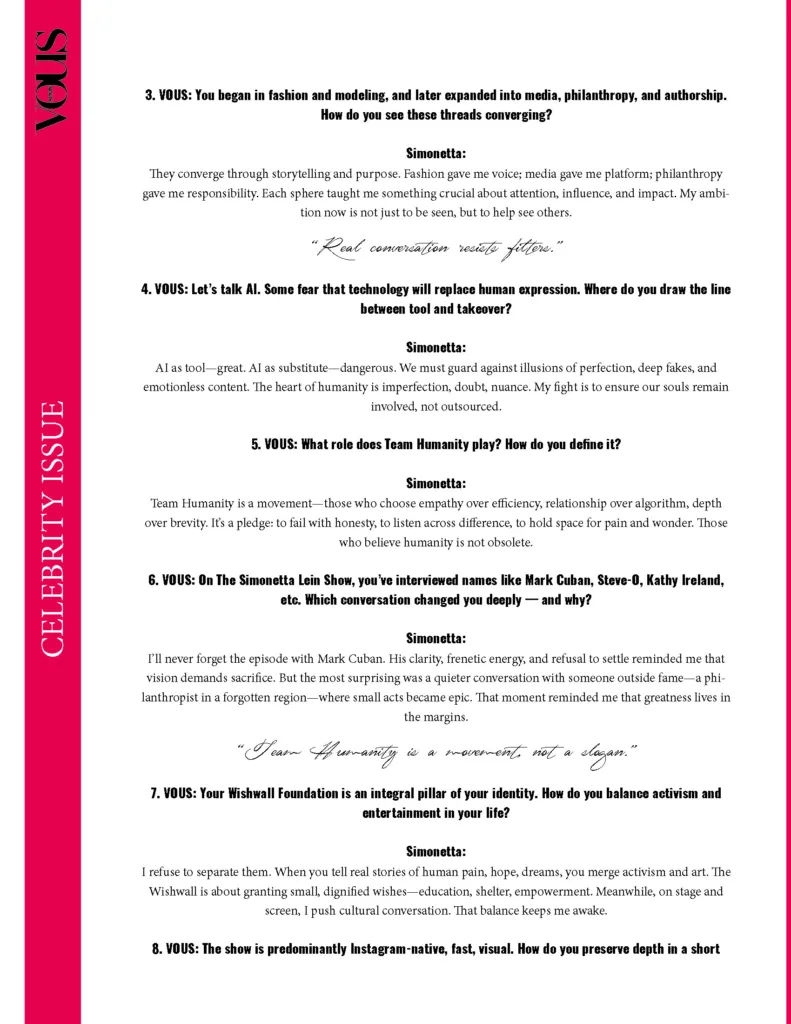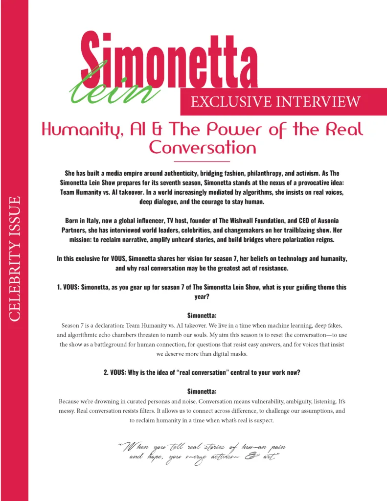 As the world edges further into the age of artificial intelligence, Simonetta Lein stands as a voice of equilibrium — reminding us that progress without presence is hollow. Through The Simonetta Lein Show and her Team Humanity movement, she challenges an era obsessed with perfection to rediscover the beauty of imperfection, compassion, and curiosity.
