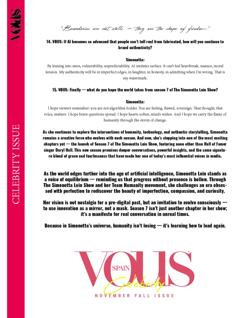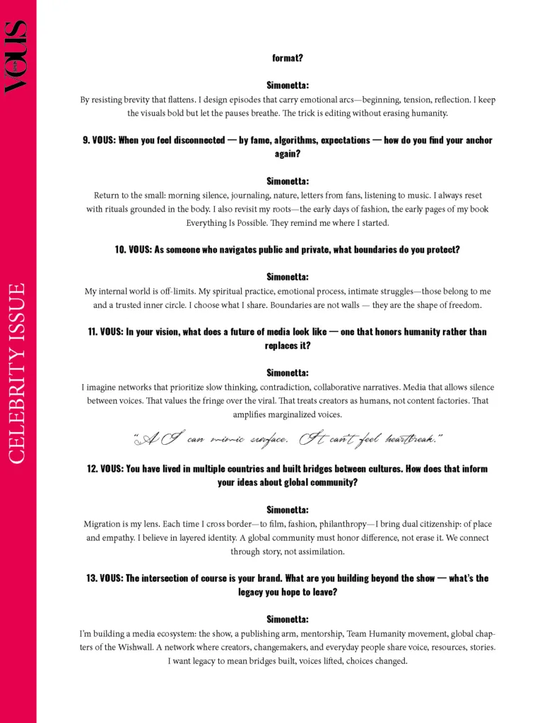 In this exclusive for VOUS, Simonetta shares her vision for season 7, her beliefs on technology and humanity, and why real conversation may be the greatest act of resistance.
